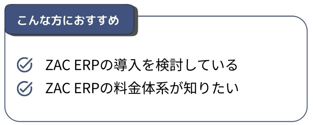 ZAC ERPの利用料金は、あらかじめ決められた一律価格ではなく、利用企業ごとに個別見積もりによって決定します。ZACはプロジェクト型ビジネスに特化したERPであり、企業によって必要となる機能や利用人数、運用方法が大きく異なるためです。