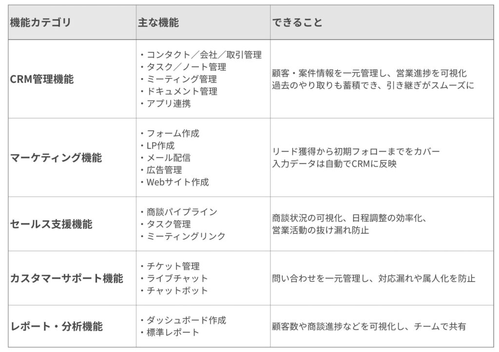 顧客管理を軸に、マーケティング・営業・カスタマーサポート・Webサイト管理までをまとめて使えるオールインワン型のCRMとして提供されています。